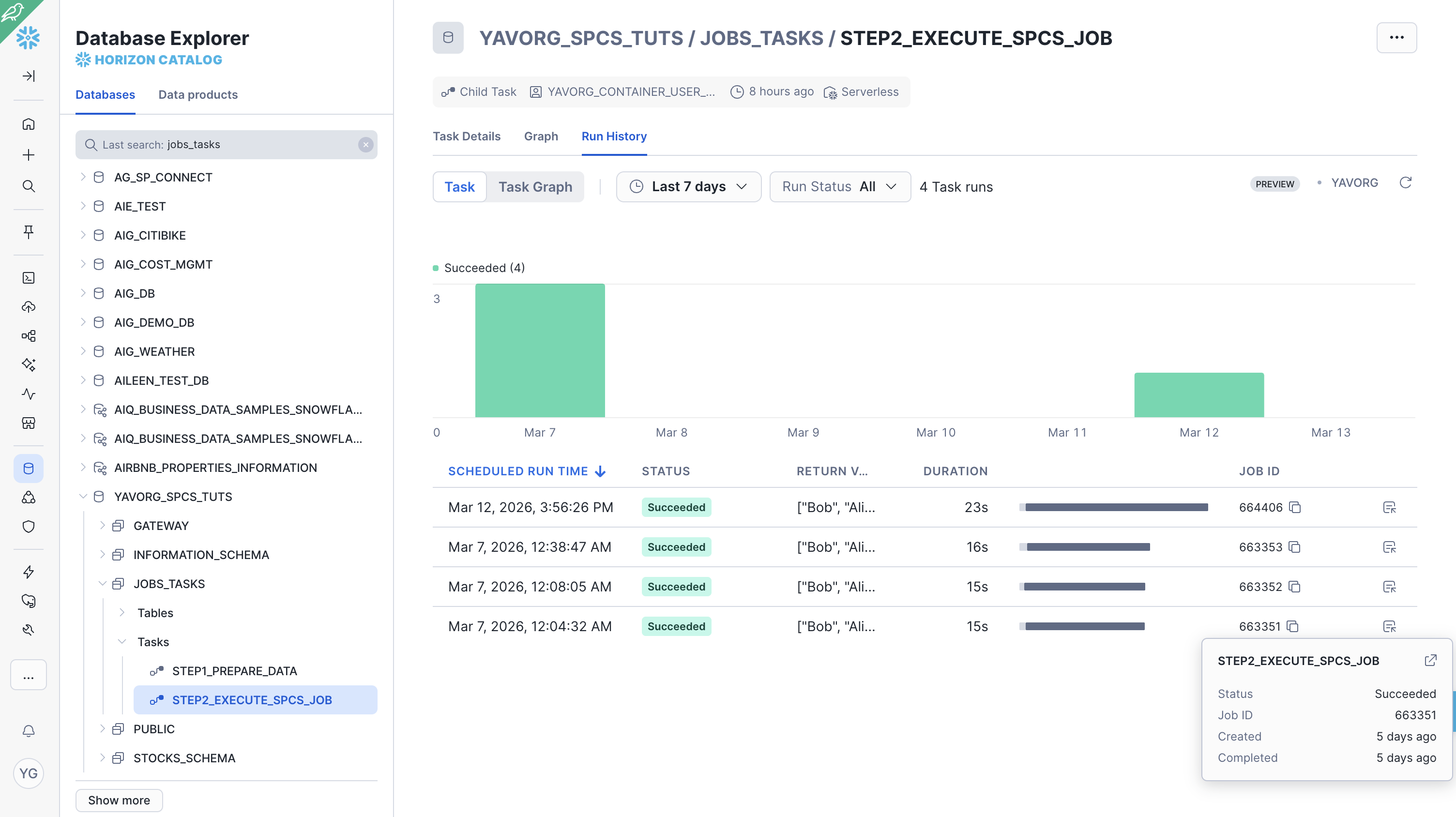 With task graphs/DAGs customers can express multi-step dependencies (including parallel branches and fan-in/fan-out patterns) as a single coordinated workflow rather than stitching together external schedulers and custom glue code, and because execution is surfaced directly in Snowsight, operators get built-in observability — visual graph views, run history, node-level status, and fast drill-down straight into SPCS telemetry for troubleshooting and reruns.